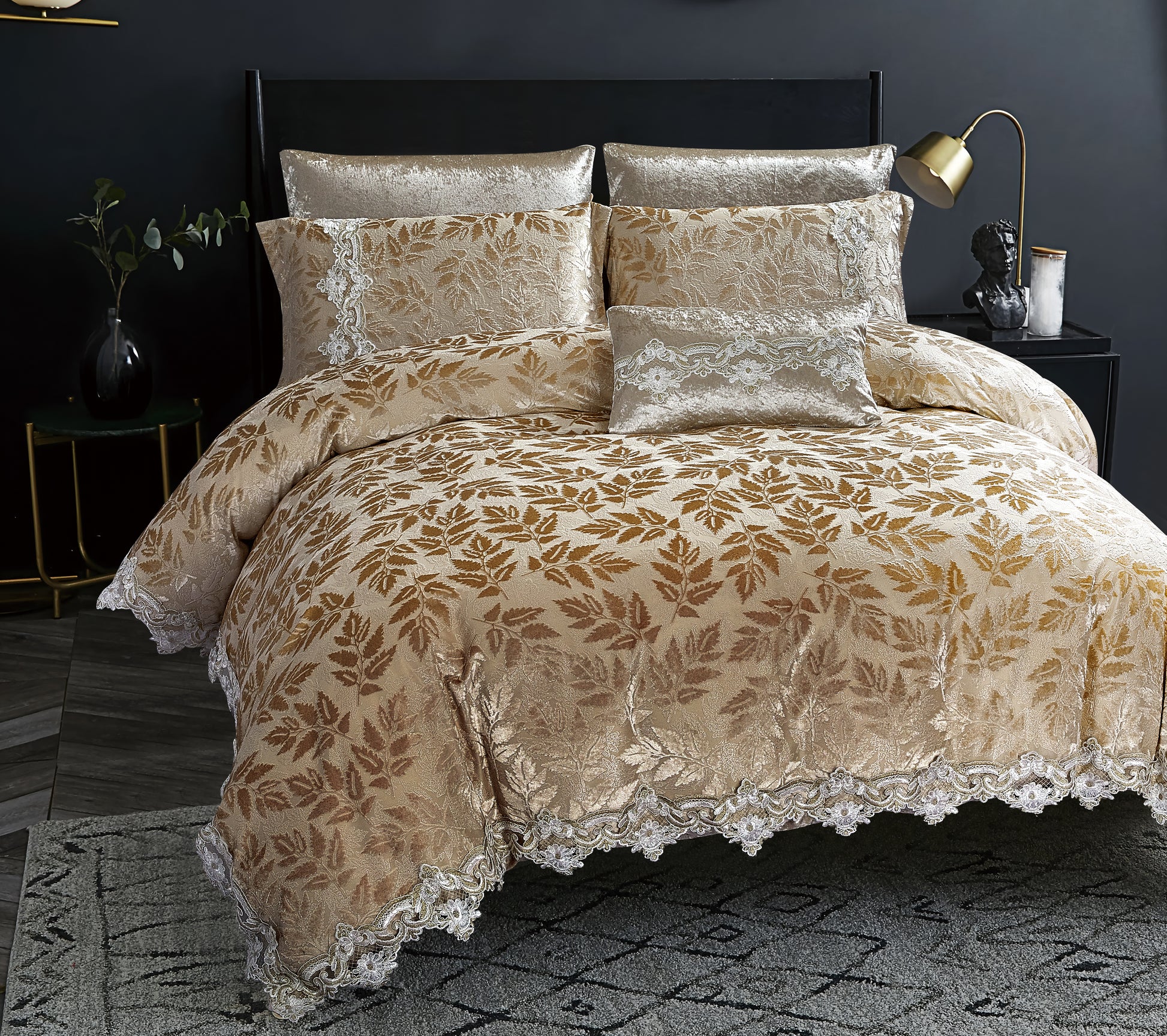 Bettdeckenset mit goldenem Blattdruck und Spitzendetails