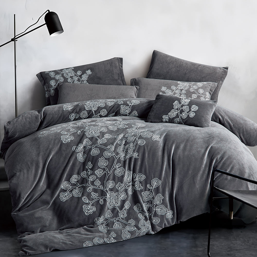 Graues Bettdeckenset mit weiß gesticktem Blumenmuster