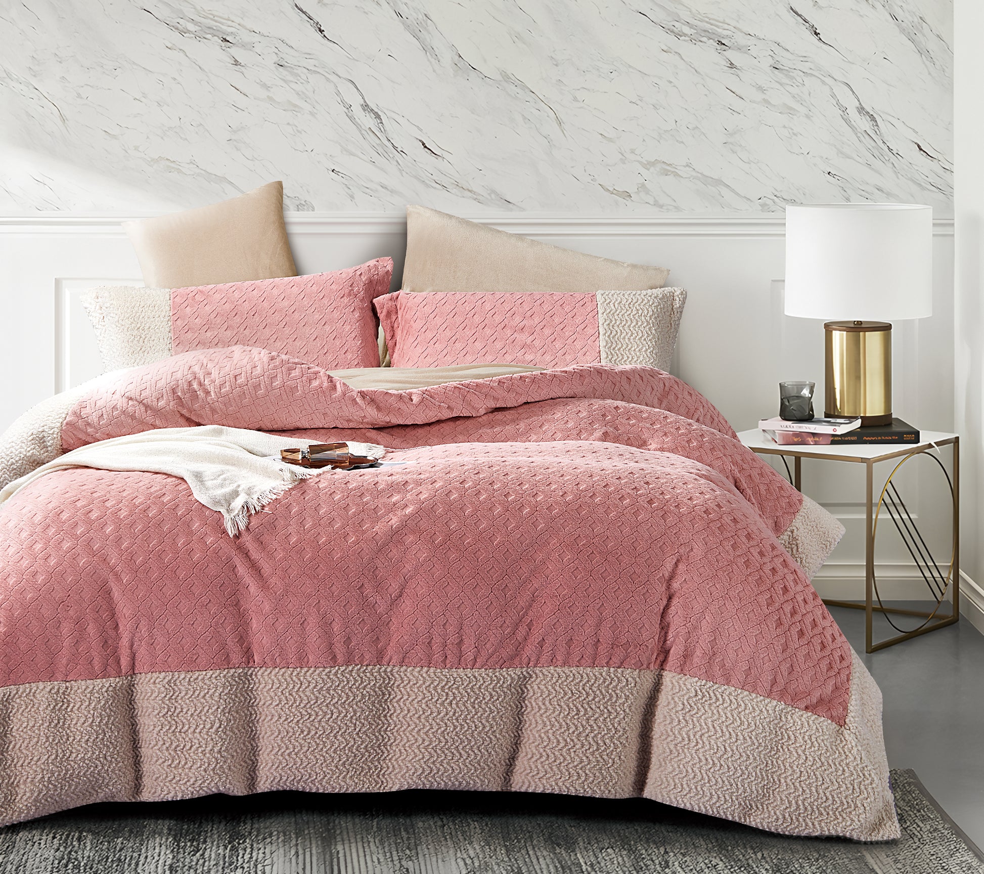Rosa Bettdeckenset mit strukturierten Details und Kissenbezügen